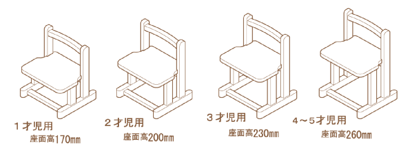 0才児用、1才児用、の座面高は同じ(170ミリ)で、テーブルは同じ高さ(340ミリ)のものが使えます。